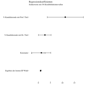 Wenn man für die 16 Listen den Stimmanteil der CDU in den jeweiligen Ländern auf das Ergebnis bei der vorherigen Europawahl regressiert und zudem noch für den Anteil der Kandidierenden auf dem Wahlzettel kontrolliert, die einen Doktortitel bzw. einen Professorentitel führen, lassen sich je einen separater Effekt für Kandierende mit Doktortitel und Professorentitel identifizieren. Diese Effekte sind folglich unabhängig von der zu erwartenden Stärke einer Landesliste sofern das durch den Stimmenanteil bei der vorherigen Wahl kontrolliert werden kann.