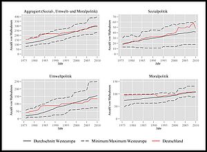 Dieser Prozess der Politikakkumulation vollzieht sich bereits seit Jahrzehnten und lässt sich in vielen Staaten und Politikbereichen beobachten. In unserer Forschung erfassen wir Politikakkumulation für 21 OECD Staaten in den Bereichen der Umwelt- und Sozialpolitik, sowie in Bereichen, die sich der sogenannten „Moralpolitik“ zuordnen lassen, wie etwa Sterbehilfe, Abtreibung, oder Prostitution. Die Abbildung 1 zeigt für diese drei Politikbereiche die durchschnittlichen Akkumulationsraten für 15 Staaten Westeuropas. Obwohl der Akkumulationsprozess nicht in allen Ländern und Politikfeldern gleich stark ausgeprägt ist (was auch an den unterschiedlichen Skalen der Y-Achsen in den Grafiken deutlich wird), ist der generelle Trend eindeutig: in nahezu allen Ländern und Politikfeldern verzeichnen wir eine stetig wachsende Anzahl an politischen Maßnahmen (Policy Outputs).