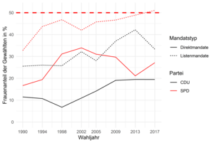 Abbildung 1: Frauenanteil unten der über Liste und Direktmandate gewählten von CDU und SPD im Zeitverlauf.
