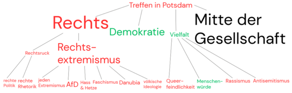 Im Vorfeld dominierten inklusive und offene Botschaften. Die zentralen leeren Signifikanten in der Vorberichterstattung waren „gegen Rechts“ und „Mitte der Gesellschaft“, wobei das Treffen in Potsdam als Auslöser der angekündigten Proteste galt. Wir visualisieren die relative Bedeutung der leeren Signifikanten sowie ihre Ausdifferenzierungen in Abbildung 1. Rot markierte Begriffe sind leeren Signifikanten, gegen die sich die Ingroup abgrenzt, während grüne Begriffe für ihre positiven Bezugspunkte stehen.