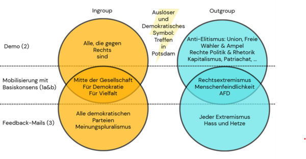 Doch die für Mouffe zentrale Ablehnung der herrschenden Eliten wurde von einer Mehrheit der Teilnehmenden ausdrücklich zurückgewiesen. Die Demonstrierenden wollten keinen Systemwechsel, sondern gerade das bestehende System verteidigen. In Abbildung 2 visualisieren wir die verschiedenen In- und Outgroups sowie die Überschneidungen zwischen den verschiedenen Phasen der Mobilisierung (1), der Demonstration (2) und dem abschließenden Feedback (3).