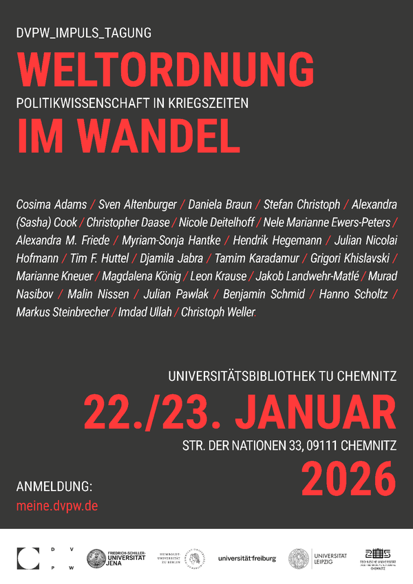 Die 1. DVPW-Impuls-Tagung wird zum Thema "Weltordnung im Wandel – Politikwissenschaft in Kriegszeiten" am 22. bis 23. Januar 2026 an der Technischen Universität Chemnitz stattfinden. Die Tagung wird von Lukas Hämisch, Dr. Jakob Kullik, Moritz Pitscheider und (alle TU Chemnitz), Heleen Matton (Humboldt-Universität zu Berlin) und Heinrike Rustenbeck (Friedrich-Schiller-Universität Jena) organisiert. Weitere Organisatoren sind PD Dr. Martin Baesler (Universität Freiburg), Dr. Frank Schale (TU Chemnitz) und Dr. Daniel Schmidt (Universität Leipzig).
